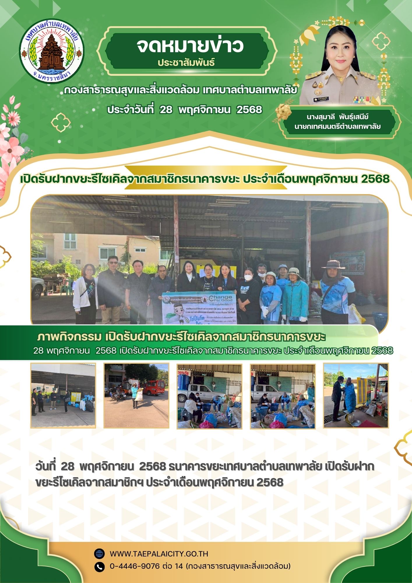 วันที่ 28 พฤศจิกายน 2568 ธนาคารขยะเทศบาลตำบลเทพาลัย ดำเนินกิจกรรมรับฝากขยะรีไซเคิลจากสมาชิกธนาคารขยะ ประจำเดือนพฤศจิกายน 2568