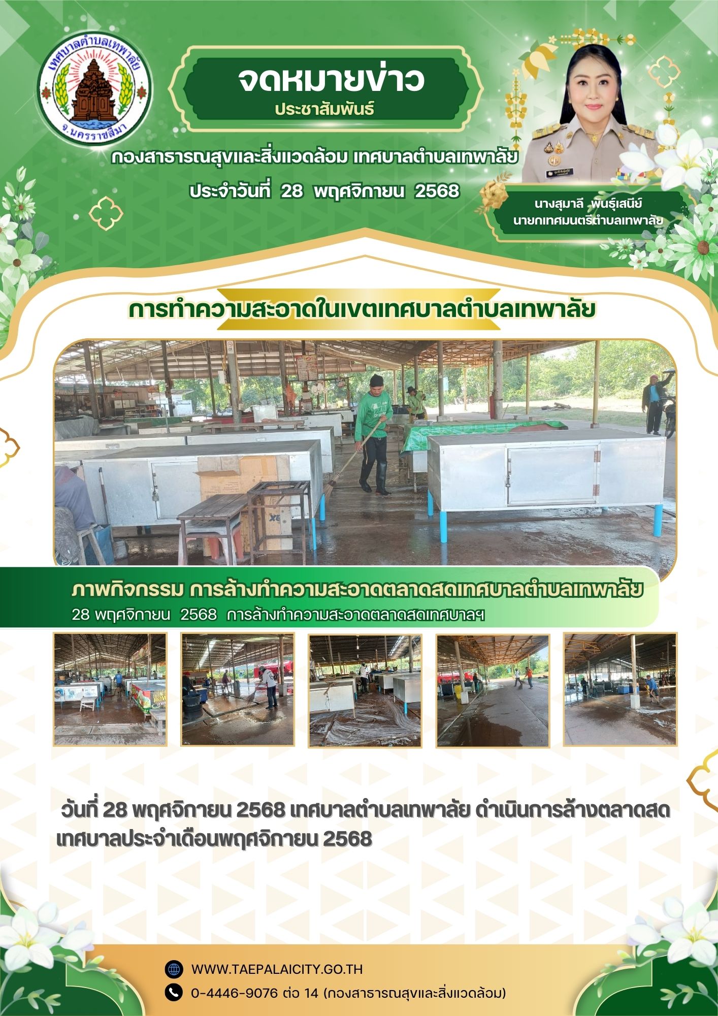 วันที่ 28 พฤศจิกายน 2568 อถล. เทศบาลตำบลเทพาลัย ดำเนินกิจกรรมล้างทำความสะอาดตลาดสดเทศบาลฯ ประจำเดือนพฤศจิกายน 2568