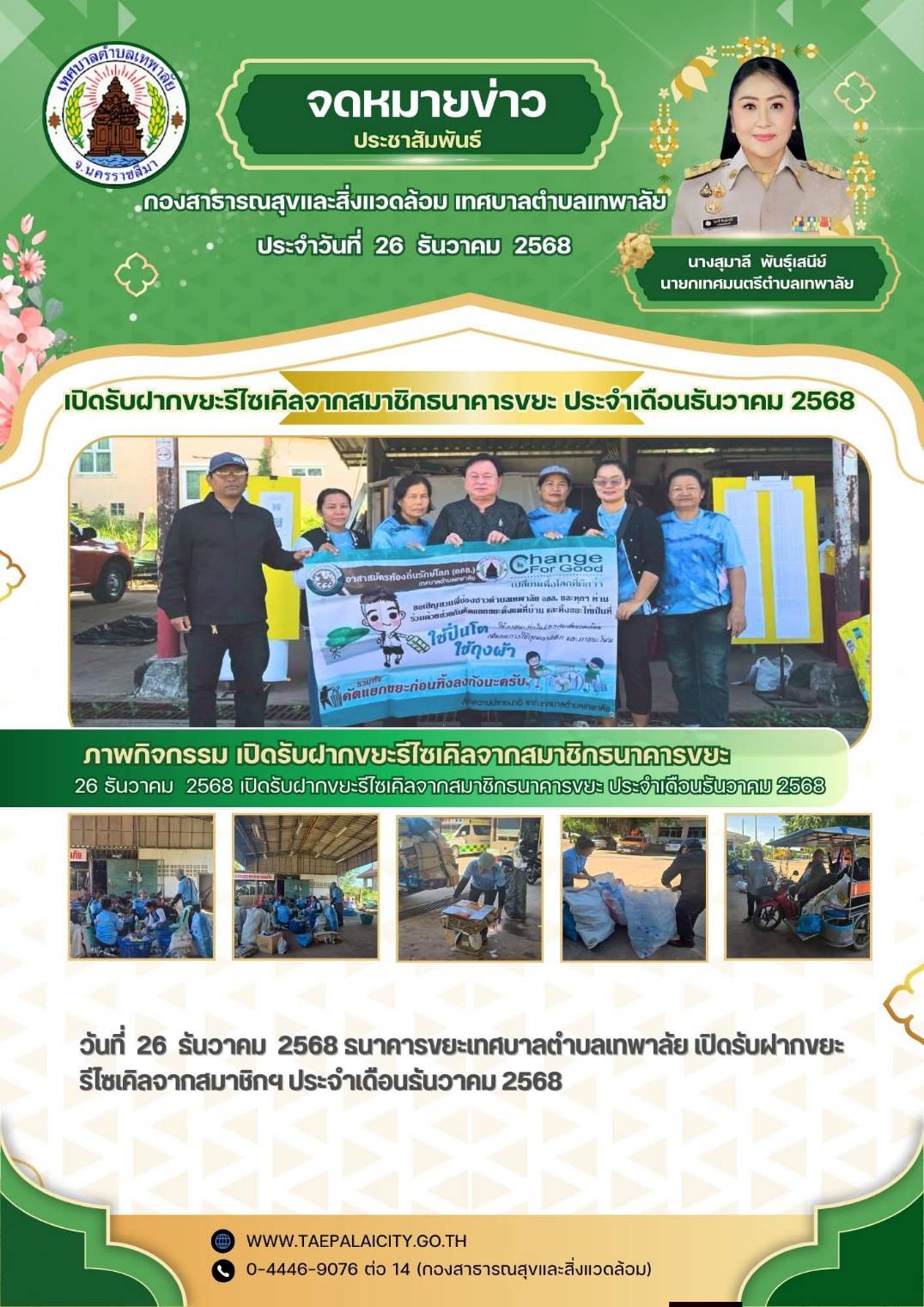 วันที่ 26 ธันวาคม 2568 ธนาคารขยะเทศบาลตำบลเทพาลัย ดำเนินกิจกรรมรับฝากขยะรีไซเคิลจากสมาชิกธนาคารขยะ ประจำเดือนธันวาคม 2568