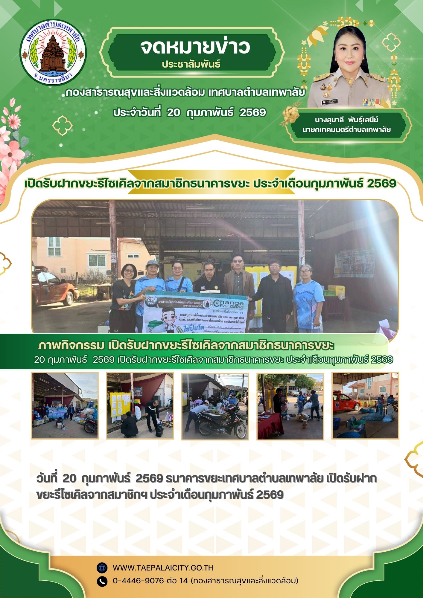 วันที่ 20 กุมภาพันธ์ 2569 ธนาคารขยะเทศบาลตำบลเทพาลัย ดำเนินกิจกรรมรับฝากขยะรีไซเคิลจากสมาชิกธนาคารขยะ ประจำเดือนกุมภาพันธ์ 2569 โดยมี อถล.ทต.เทพาลัย เข้าร่วมกิจกรรมคัดแยกขยะ ลดปริมาณขยะ