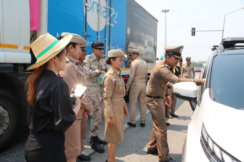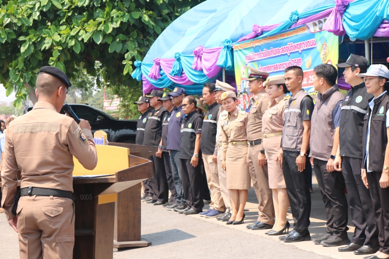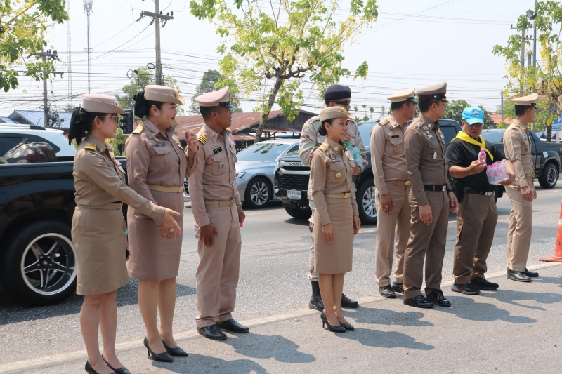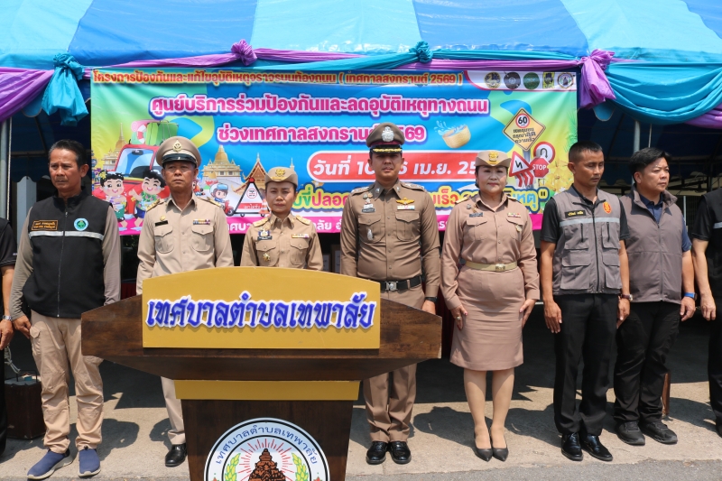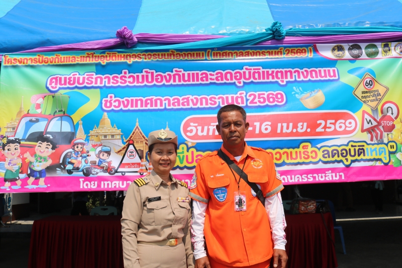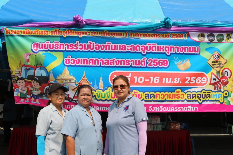 นางสาวนิชาพิชญ์ รักษาภักดี นายอำเภอคง นางสุมาลี พันธ์ุเสนีย์ นายกเทศมตรีตำบลเทพาลัย หัวหน้าส่วนราชการอำเภอคง กำนัน ผู้ใหญ่บ้าน ผู้ช่วยผู้ใหญ่บ้าน อสม.ตำบลเทพลัย กู้ภัยฮุก 31 จุดบ้านวัด รื่นจิตอาสา เปิดศูนย์บริการร่วมป้องกันและลดอุบัติเหตุทางถนน ช่วงเทศกาลสงกรานต์ 2569 ณ จุดสกัดบ้านวัด