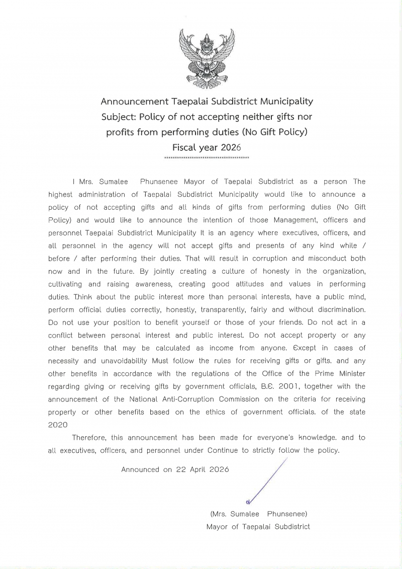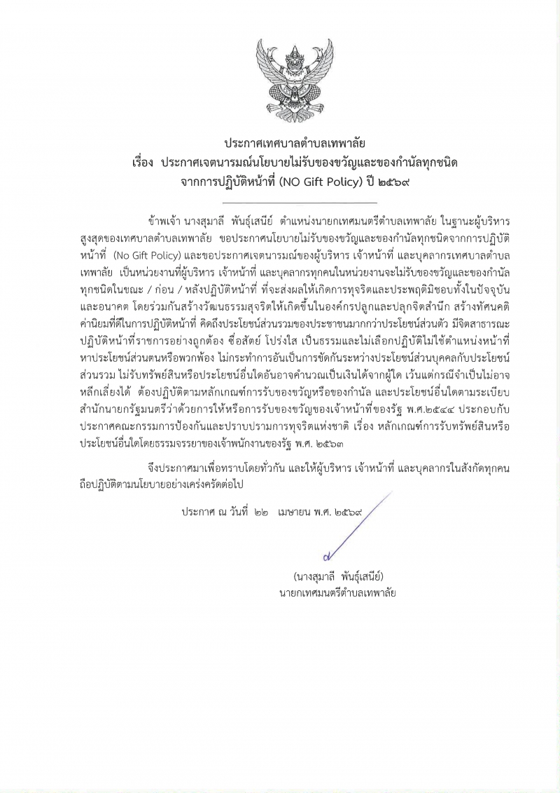ขาพเจ้า นางสุมาลี พันธุ์เสนีย์ ตำแหน่งนายกเทศมนตรีตำบลเทพาลัย ในฐานะผู้บริหารสูงสุดของเทศบาลตำบลเทพาลัย ขอประกาศนโยบายไม่รับของขวัญและของกำนัลทุกชนิดจากการปฏิบัติหน้าที่ (No gift Policy) และขอประกาศเจตนารมณ์ของผู้บริหาร เจ้าหน้าที่ และบุคลากรเทศบาลตำบลเทพาลัย เป็นหน่วยงานที่ผู้บริหาร เจ้าหน้าที่ และบุคลากรทุกคนในหน่วยงานจะไม่รับของขวัญและของกำนัลทุกชนิดในขณะ / ก่อน / หลังปฏิบัติหน้าที่ ที่จะส่งผลให้เกิดการทุจริตและประพฤติมิชอบทั้งในปัจจุบันและอนาคต