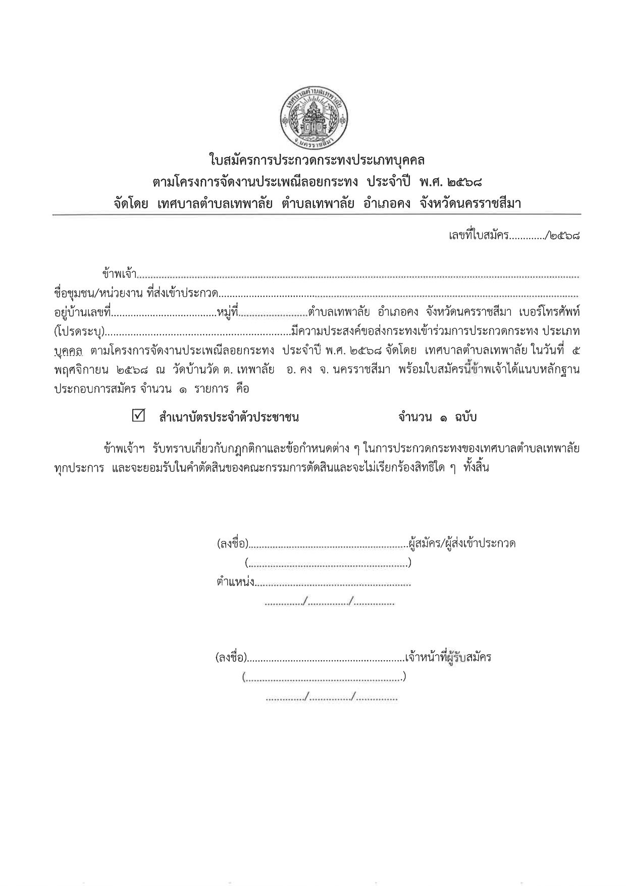 ใบสมัครการประดิษฐ์ประกวดกระทงสวยงาม ประจำปี พ.ศ.2568
