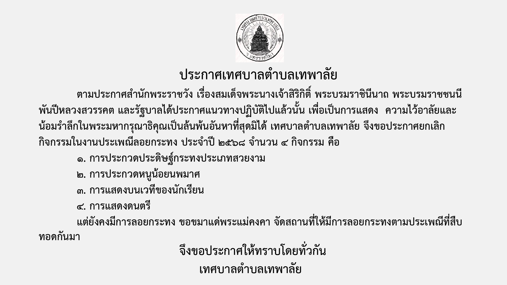 ตามประกาศสำนักพระราชวัง เรื่องสมเด็จพระนางเจ้าสิริกิติ์ พระบรมราชินีนาถ พระบรมราชชนนีพันปีหลวงสวรรคต และรัฐบาลได้ประกาศแนวแทางการปฏิบัติไปแล้วนั้น เพื่อเป็นการแสดงความไว้อาลัยและน้อมรำลึกในพระมหากรุณาธิคุณเป็นล้นพ้นอันหาที่สุดมิได้ เทศบาลตำบลเทพาลัย จึงขอประกาศยกเลิกกิจกรรมในงานประเพณีลอยกระทง ประจำปี 2568 จำนวน 4 กิจกรรม คือ