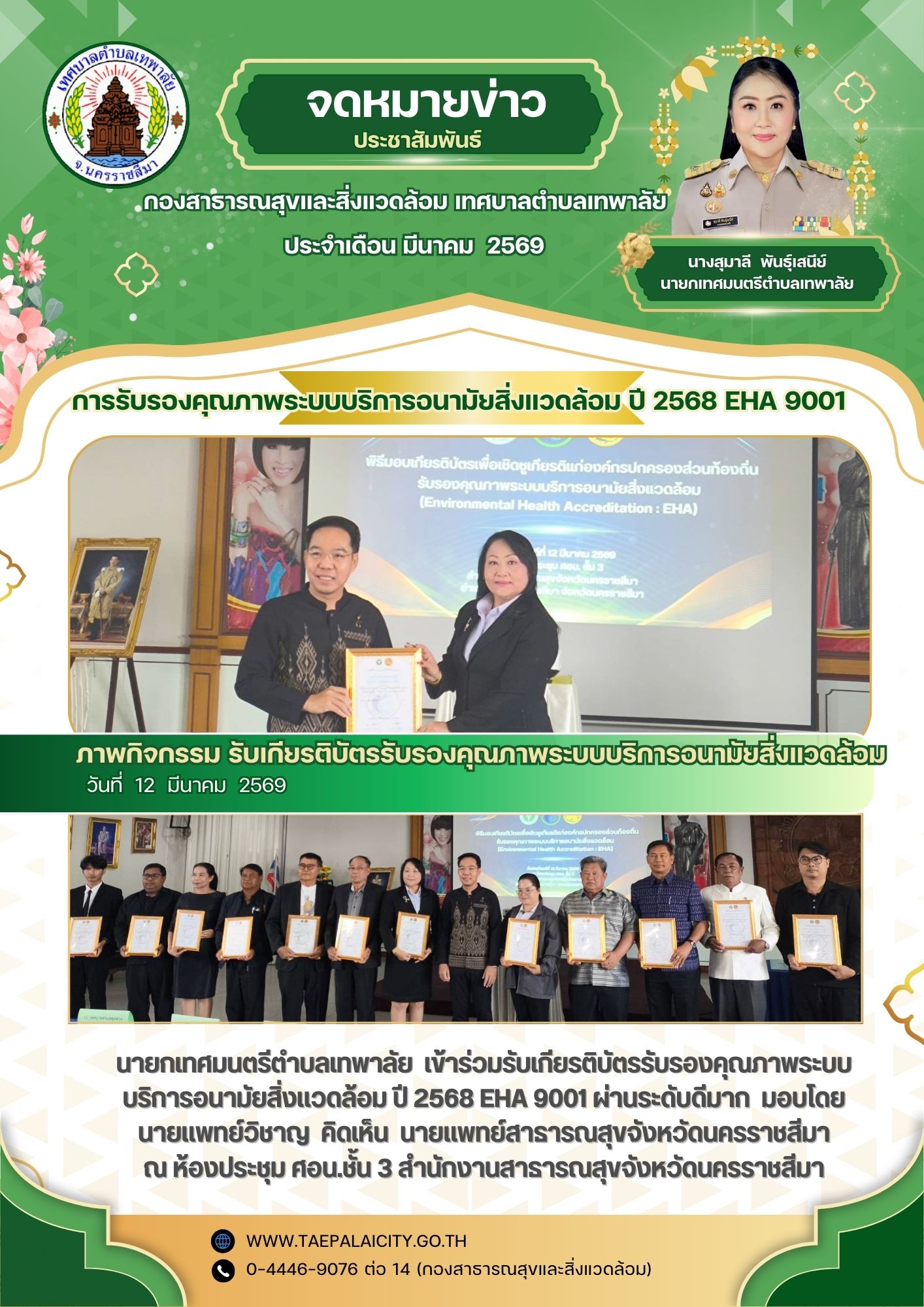 วันที่ 12 มีนาคม 2569 นางสุมาลี พันธุ์เสนีย์ นายกเทศมนตรีตำบลเทพาลัย เข้าร่วมรับเกียรติบัตรรับรองคุณภาพระบบบริการอนามัยสิ่งแวดล้อม ปี 2568 EHA 9001 ผ่านระดับดีมาก มอบโดย นายแพทย์วิชาญ คิดเห็น นายแพทย์สาธารณสุขจังหวัดนครราชสีมา ณ ห้องประชุม ศอน.ชั้น 3 สำนักงานสาธารณสุขจังหวัดนครราชสีมา