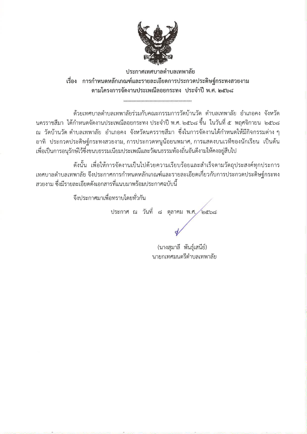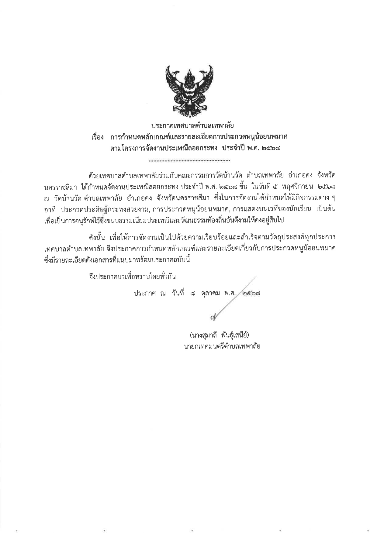 ประกาศหลักเกณฑ์และรายละเอียดการประกวดหนูน้อยนพมาศ ตามโครงการจัดงานประเพณีลอยกระทง ประจำปี พ.ศ.2568 |