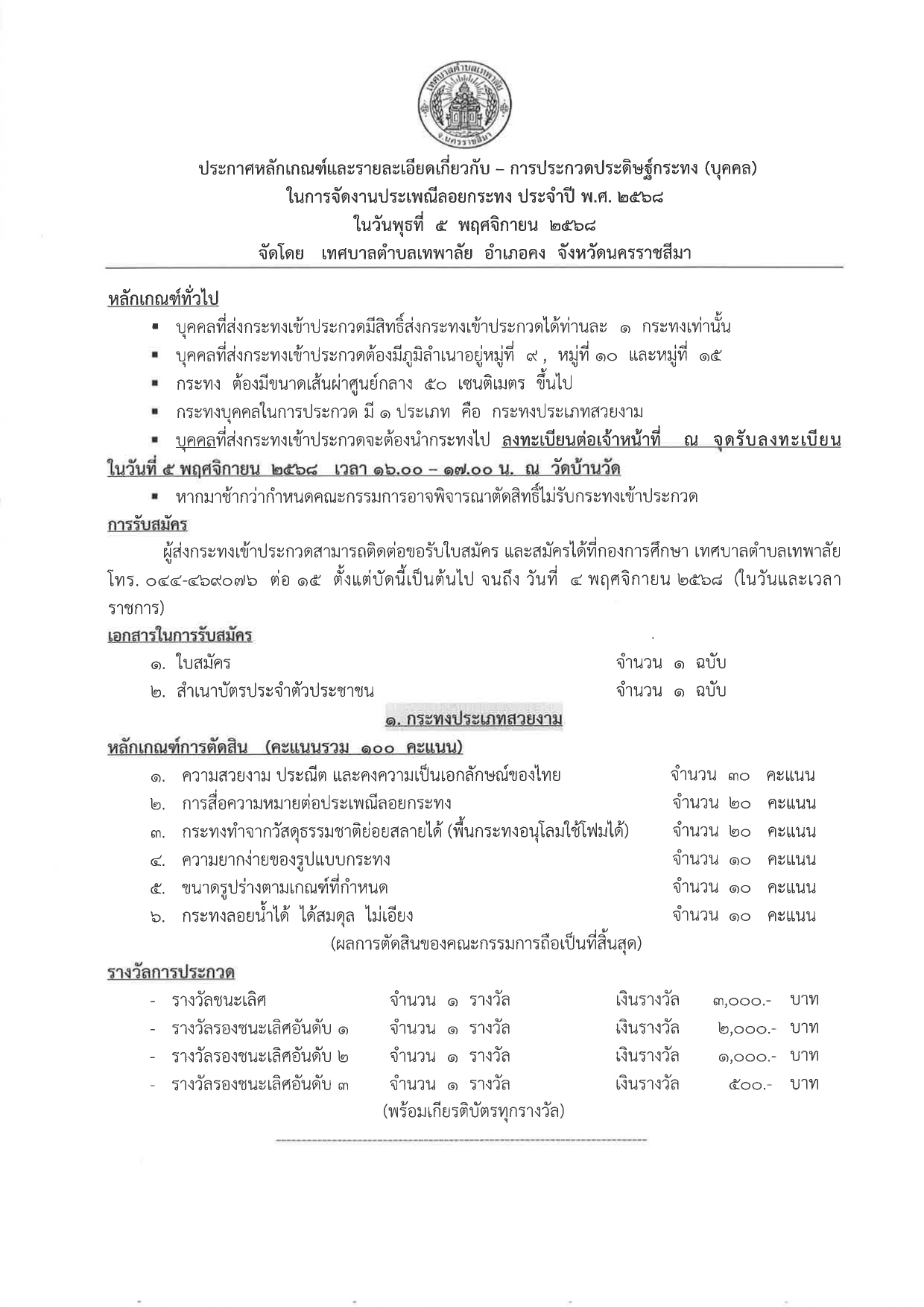 ประกาศหลักเกณฑ์และรายละเอียดการประกวดประดิษฐ์กระทงสวยงาม โครงการจัดงานประเพณีลอยกระทง ประจำปี พ.ศ.2568